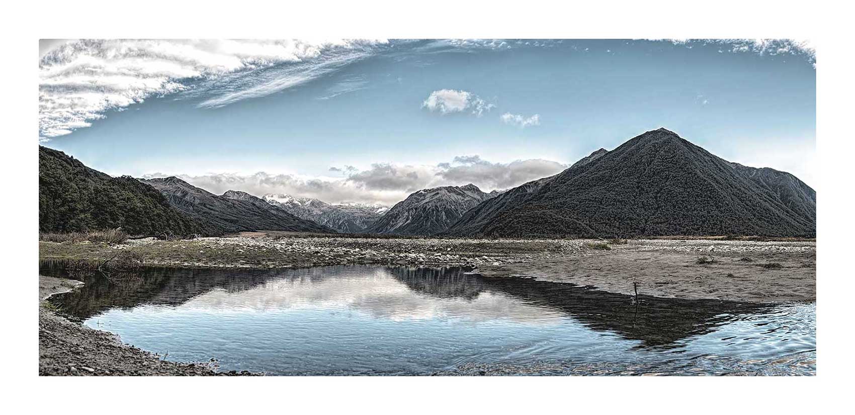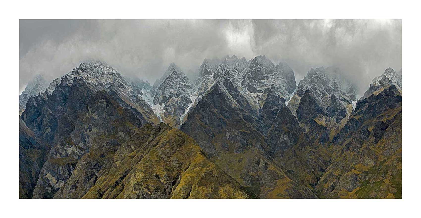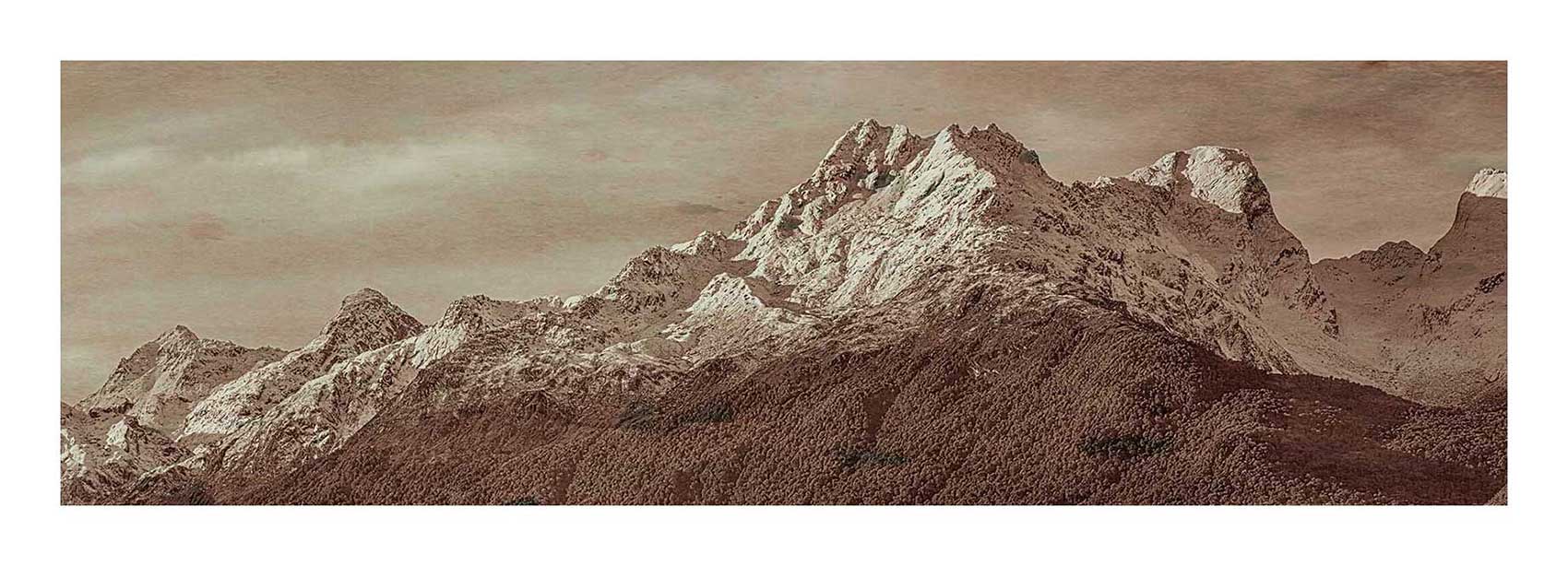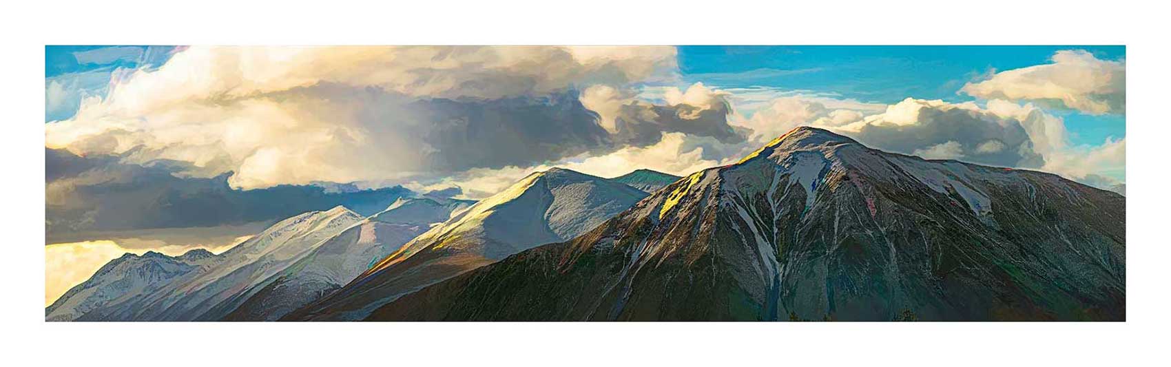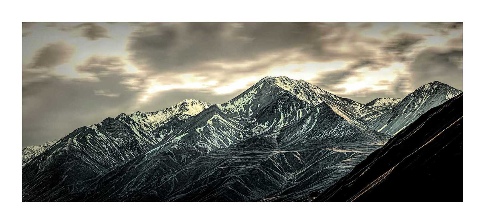 Dark rocked mountain with slivers of snow on face and sunset sky.