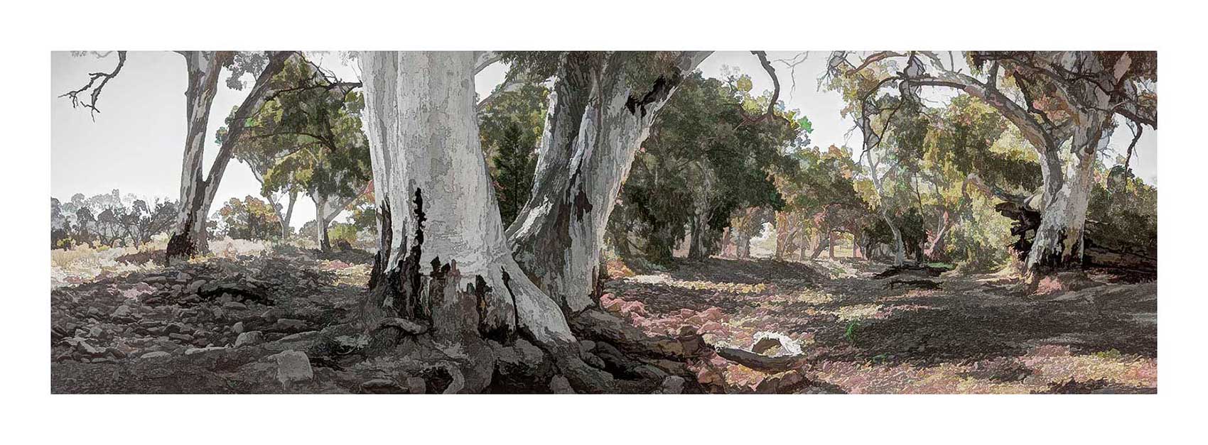 Huge Redgums in dry creek bed where they have thrived on occasional floods for decades.