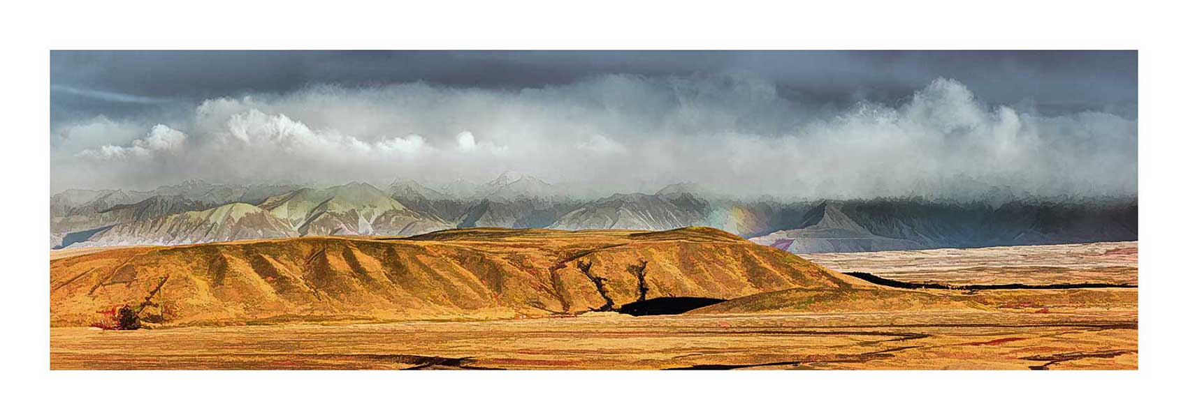 Sunrise orange light on row of mountains with background low cloud and rainbow.