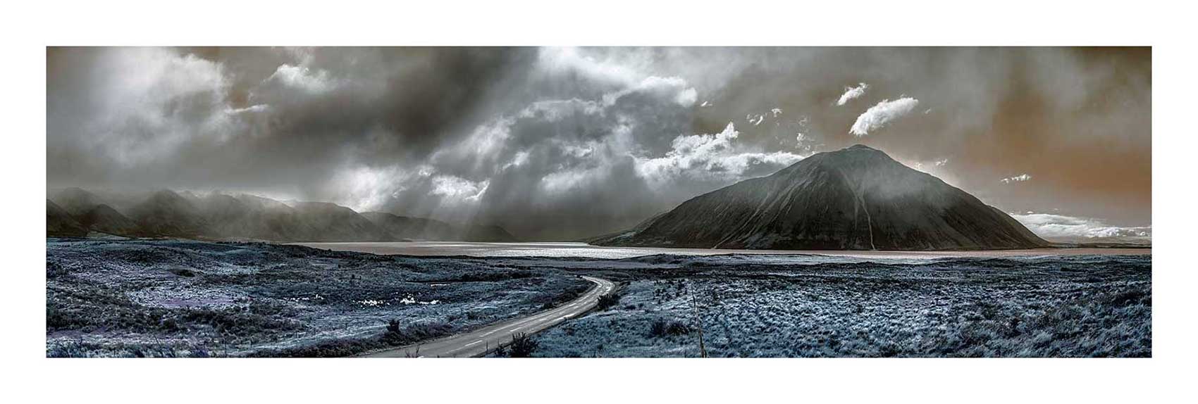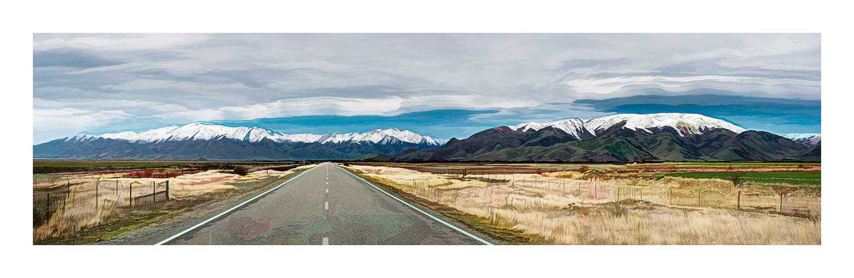 Straight asphalt road heads towards straight line of snowy mountains with lenticular clouds.